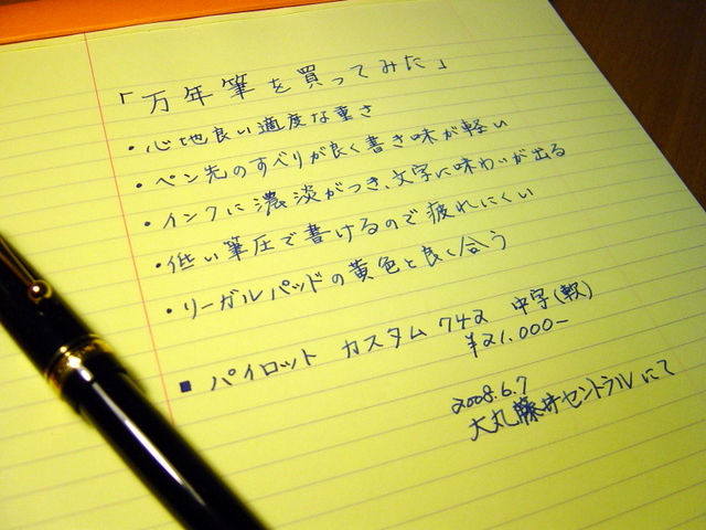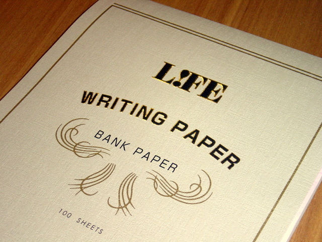 LIFE Writing Paper T25 (リンク先はアサヒヤ紙文具店)という紙に書いてみました。バンクペーパーと呼ばれる紙で、緻密で裏抜けしにくく表面も平滑なので万年筆にはもってこいです。裏抜けしにくいぶん、太めの万年筆を使うとややインクの吸い込みが遅いですが、そんなことを考慮してかこの用紙にはインク吸い取り紙が1枚ついてきます。リーガルパッドのように普段バリバリ使えませんが、ここぞというときにさりげなく使っています。 ちなみに札幌ではいまのところ大丸藤井セントラルの万年筆コーナーでしかみかけたことがありません。