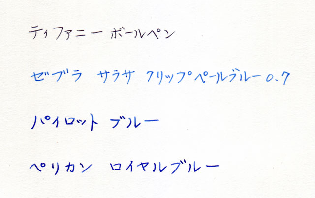 3番目は万年筆で、パイロットのブルー。にじみも少なく、落ち着いた青色です。インクが濃い部分はやや光沢のある紫色っぽい感じに見えます。比較的紙を選ばないバランスの取れたインクだと思います。パイロットの万年筆にパイロットのインクを使っているせいかどうかはわかりませんが、書き味もなめらかです。