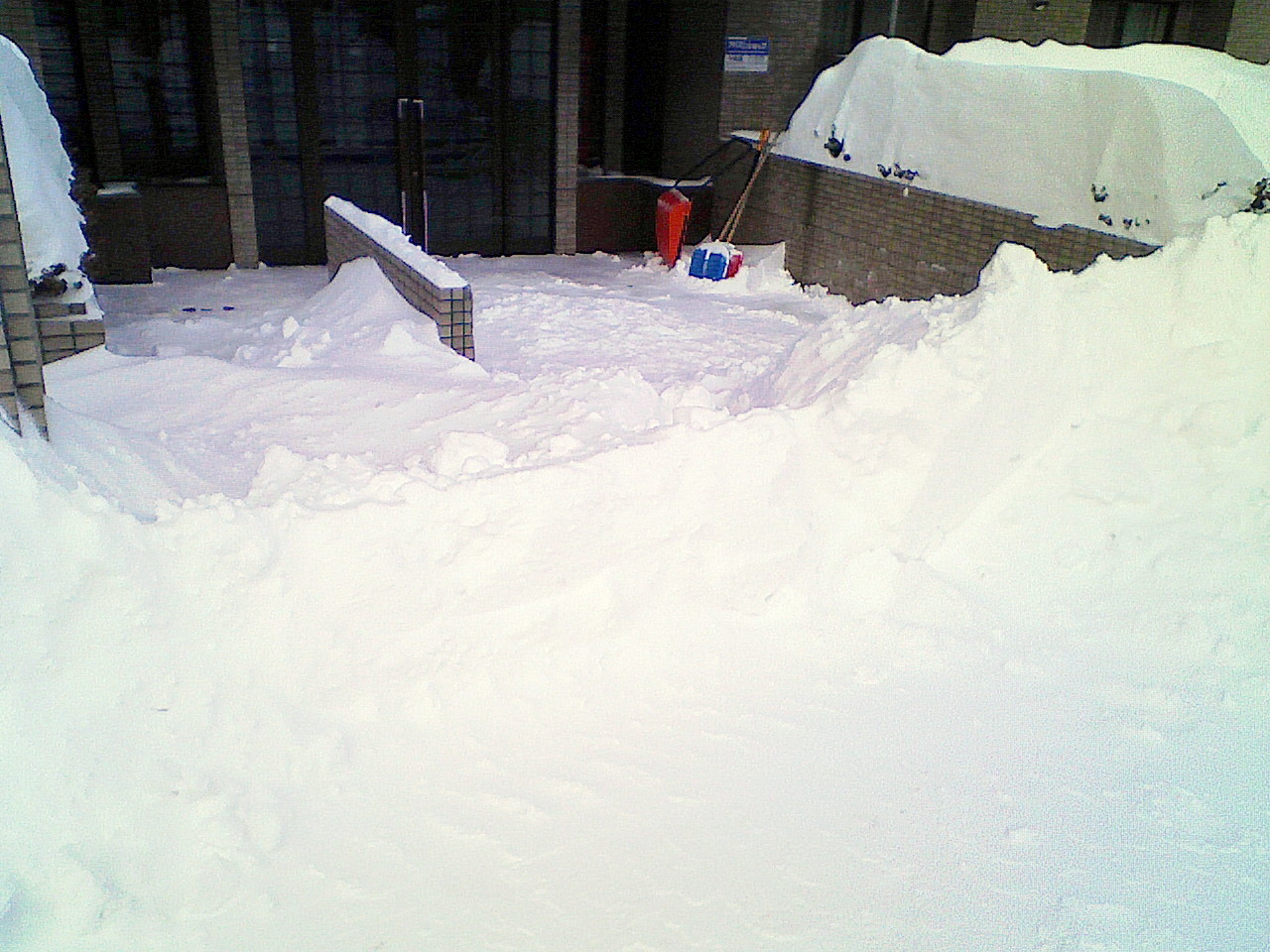 隣の棟に除雪車が入っていたので、おそらく除雪した雪が一時的に堆積したのと+雪+風で、とてもじゃないけど玄関まで行けそうにない。