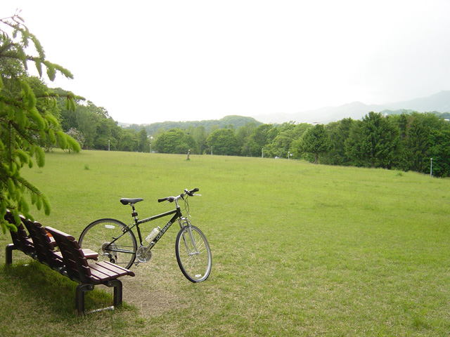 さて、自転車は真駒内公園に入り、今日はちゃんと3km周回コースを見つけられて一回り。1.5キロ地点まで上り坂でちょうどそのあたりに、開けた高台があって、絶好の休憩スペース。トップの写真はそこのものです。